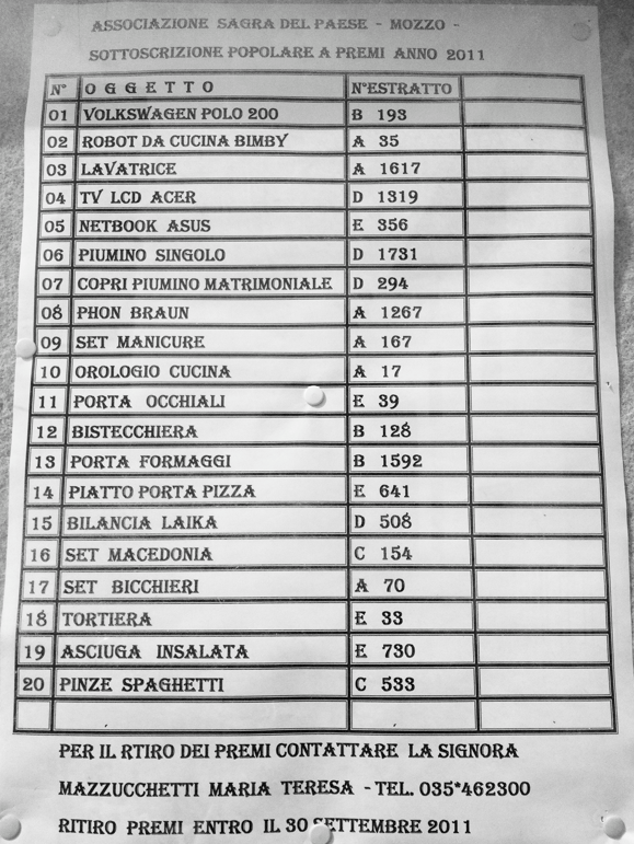 Sagra di Mozzo: i numeri estratti alla sottoscrizione popolare admin11 luglio 201113 luglio 2011 Navigazione articoli PrecedenteContinua Condividi:CondivisioneTweet Fai clic qui per stampare (Si apre in una nuova finestra) Stampa Fai clic per inviare un link a un amico via e-mail (Si apre in una nuova finestra) E-mail Mi piace Caricamento... Correlati