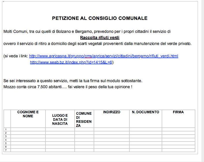Questa petizione vorrebbe sensibilizzare il Consiglio Comunale perché’ si adoperi per l’attivazione di un servizio di ritiro di scarti vegetali presso le abitazioni private come già’ avviene nel Comune di Bergamo e nel Comune di Bolzano ad esempio.
