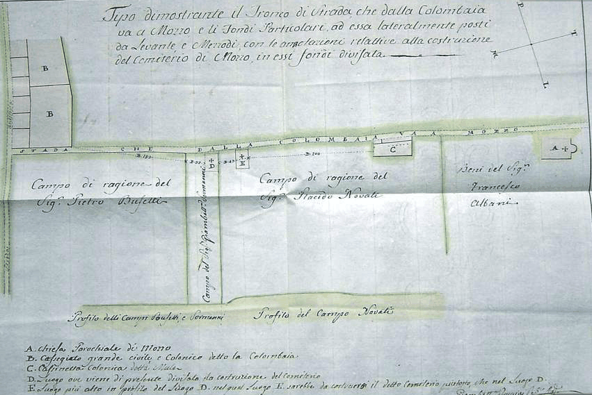 Anche a Mozzo le autorità dovettero decidere dove edificare il nuovo cimitero e le prime notizie in tal senso risalgono al maggio 1808, data in cui il perito Francesco Bolis produsse una relazione sul sito prescelto. Queste informazioni e quelle che seguiranno sono tratte dal materiale collocato nell’archivio del Dipartimento del Serio, conservato all’Archivio di Stato di Bergamo (busta 1220).