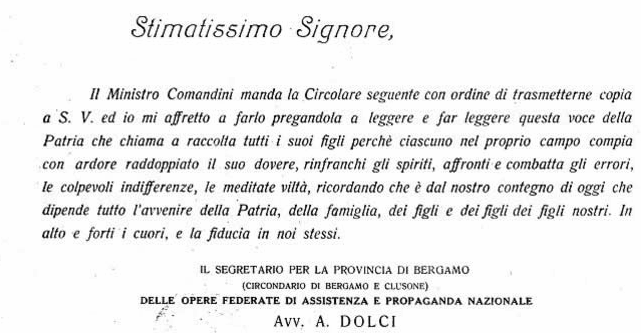 E Mozzo, in tutto questo cosa c’entra? C‘entra, come c’entrano tutti i comuni italiani, caratterizzati da monumenti ai caduti che fanno bella mostra nelle piazze della Penisola. Mozzo ha avuto i suoi caduti ed è probabile che nelle terribili giornate dell’ottobre 1917 anche qui si sia temuto il peggio. E l’archivio comunale ci propone un documento assai interessante, la circolare che in data 30 ottobre il ministro Ubaldo Comandini (ministro senza portafogli responsabile in particolare di opere di propaganda e di assistenza di guerra) inviò a tutti i comuni del Regno attraverso la capillare organizzazione di assistenza e propaganda presente in ogni provincia.