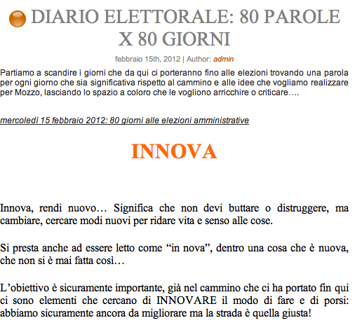 Mozzo/Elezioni2012: Innova Mozzo inaugura un diario, DIARIO ELETTORALE: 80 PAROLE X 80 GIORNI – letto su Innova Mozzo admin16 febbraio 201223 febbraio 2012blog post, elezioni Navigazione articoli PrecedenteContinua viaDIARIO ELETTORALE: 80 PAROLE X 80 GIORNI. Condividi:CondivisioneTweet Stampa (Si apre in una nuova finestra) Stampa Invia un link a un amico via e-mail (Si apre in una nuova finestra) E-mail Mi piace Caricamento... Correlati