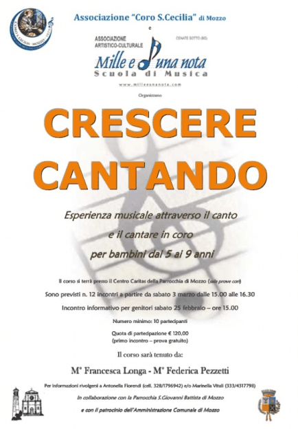 Mozzo: corso di canto bambini dai 5 ai 9 anni, 25 febbraio incontro informativo. Corale Santa Cecilia. admin21 febbraio 20123 dicembre 2012blog post Navigazione articoli PrecedenteContinua Condividi:CondivisioneTweet Fai clic qui per stampare (Si apre in una nuova finestra) Stampa Fai clic per inviare un link a un amico via e-mail (Si apre in una nuova finestra) E-mail Mi piace Caricamento... Correlati