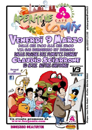 Star dell’aperitivo l’autorei Claudio Sciarrone, autore della saga “Cronache del Pianeta T” su Topolino e di alcune indimenticabili storie della serie Paperinik New Adventures! Ad accompagnarlo ci saranno Enzo Furfaro (Milite Ignoto-Pesci d’Atlantide) e Luca Rota Nodari (Bergaman-La Maschera di Arlecchino), che, assieme a lui, si esibiranno in una performance di disegno dal vivo e regaleranno sketch ai propri fans. Presenti anche altre figure a sorpresa del panorama fumettistico (consigliamo a chi ha bambini ma anche fratellini, sorelline e nipoti di portarli).