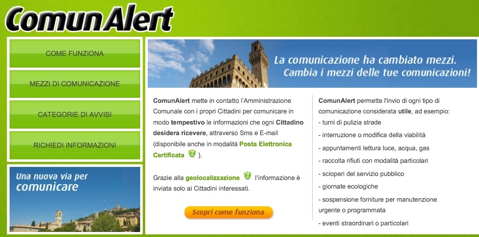 ComunAlert mette in contatto l’Amministrazione Comunale con i propri Cittadini per comunicare in modo tempestivo le informazioni che ogni Cittadino desidera ricevere, attraverso Sms e E-mail (disponibile anche in modalità Posta Elettronica Certificata