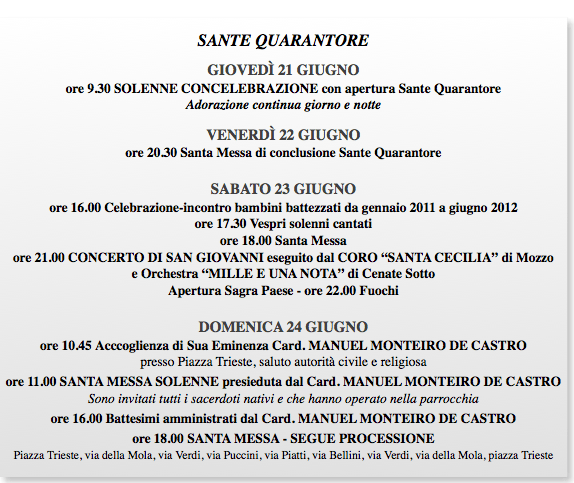 Mozzo: la Festa del santo patrono, il programma admin19 giugno 201213 giugno 2012blog post Navigazione articoli PrecedenteContinua Condividi:CondivisioneTweet Fai clic qui per stampare (Si apre in una nuova finestra) Stampa Fai clic per inviare un link a un amico via e-mail (Si apre in una nuova finestra) E-mail Mi piace Caricamento... Correlati