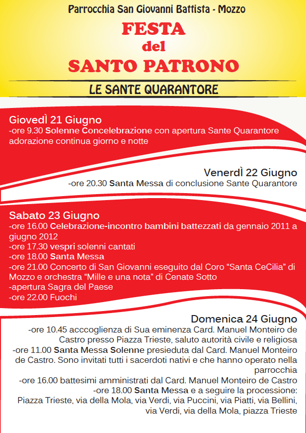 Mozzo: Festa del Santo Patrono. Tutti gli appuntamenti. admin22 giugno 2012blog post Navigazione articoli PrecedenteContinua Condividi:CondivisioneTweet Fai clic qui per stampare (Si apre in una nuova finestra) Stampa Fai clic per inviare un link a un amico via e-mail (Si apre in una nuova finestra) E-mail Mi piace Caricamento... Correlati