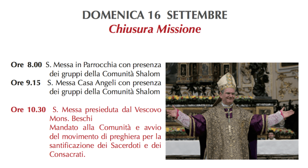 Mozzo/Missione Parrocchiale: il 16 settembre arriva il Vescovo Beschi admin14 settembre 201215 settembre 2012Missione Parrocchiale Navigazione articoli PrecedenteContinua Condividi:CondivisioneTweet Fai clic qui per stampare (Si apre in una nuova finestra) Stampa Fai clic per inviare un link a un amico via e-mail (Si apre in una nuova finestra) E-mail Mi piace Caricamento... Correlati
