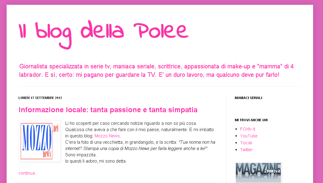 Mozzo/Celebrity: la recensione della giornalista “seriale” Chiara Poli admin17 settembre 2012blog post Navigazione articoli PrecedenteContinua Condividi:CondivisioneTweet Fai clic qui per stampare (Si apre in una nuova finestra) Stampa Fai clic per inviare un link a un amico via e-mail (Si apre in una nuova finestra) E-mail Mi piace Caricamento... Correlati