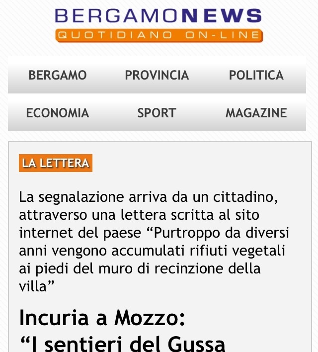 A Mozzo arrivano le prime segnalazioni di incuria. Sotto osservazione, da parte di alcuni cittadini, i sentieri attorno al Monte Gussa, dove sono stati rinvenuti numerosi rifiuti vegetali. La zona in questione riguarda alcuni sentieri che attraversano il bosco alle pendici del monte Gussa, già soggetto a numerosi interventi.