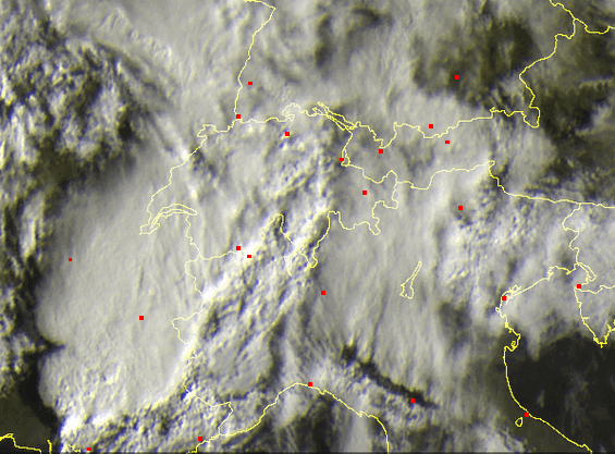 update: La fotografia scattata dal satellite alle 9:45 evidenzia il fronte temporalesco in arrivo dalla Francia, in particolare si nota il diverso spesso delle nubi temporalesche (sono molto più alte e raggiungono localmente i 9.000-10.000mt) rispetto a quelle che attualmente ricoprono il nord italia.