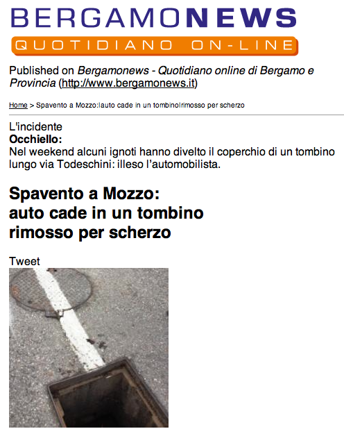Via il tombino in una strada centrale del paese e un auto di passaggio ci finisce dentro. È questo il succo di un triste piano architettato nel weekend da alcuni sconosciuti a Mozzo.