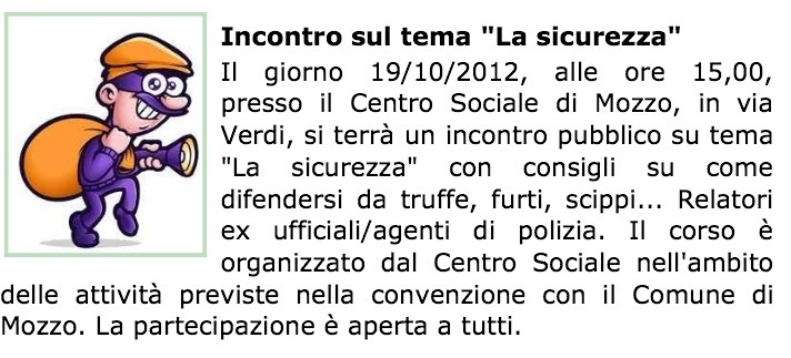 Mozzo/Furti: incontro al centro sociale venerdì 19 ore 15. Tema: sicurezza. admin11 ottobre 201213 marzo 2013Alert sicurezza Navigazione articoli PrecedenteContinua Condividi:CondivisioneTweet Fai clic qui per stampare (Si apre in una nuova finestra) Stampa Fai clic per inviare un link a un amico via e-mail (Si apre in una nuova finestra) E-mail Mi piace Caricamento... Correlati