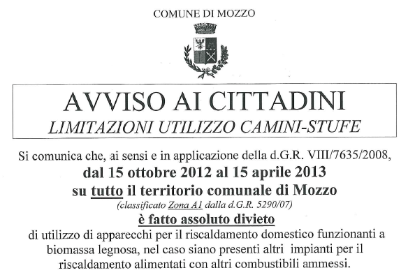 Mozzo: limitazione uso camini/stufe. AVVISO AI CITTADINI – camini – ::: Rete Civica del Comune di Mozzo ::: admin18 ottobre 201218 ottobre 2012blog post Navigazione articoli PrecedenteContinua AVVISO AI CITTADINI – camini – ::: Rete Civica del Comune di Mozzo :::. Condividi:CondivisioneTweet Fai clic qui per stampare (Si apre in una nuova finestra) Stampa Fai clic per inviare un link a un amico via e-mail (Si apre in una nuova finestra) E-mail Mi piace Caricamento... Correlati