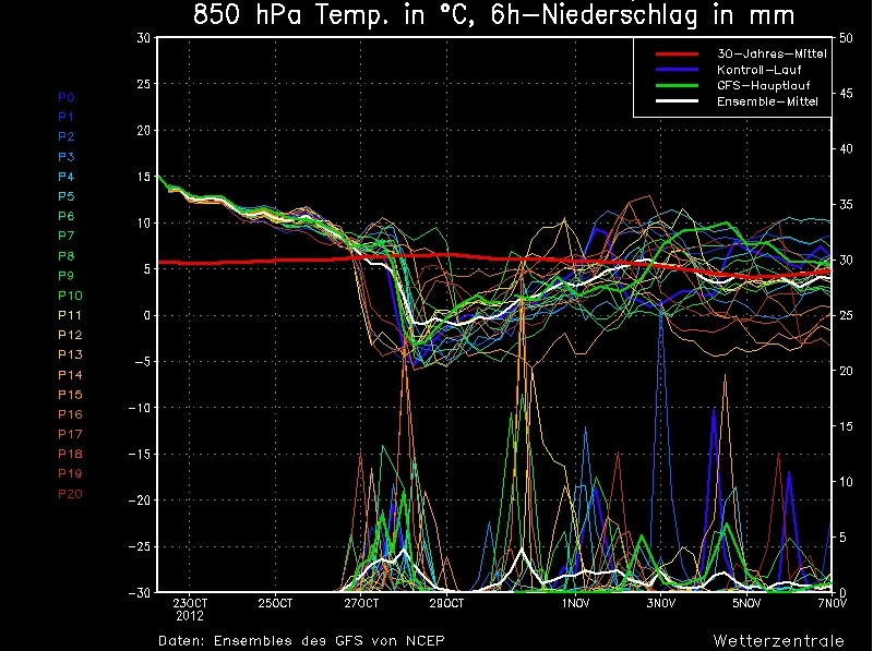La mappa si compone di nr 20 “spaghi” ognuno dei quali ipotizza un’evoluzione partendo da un comune punto di partenza, ovvero la situazione attuale (in bianco la media degli spaghi e in rosso la media termica trentennale).
