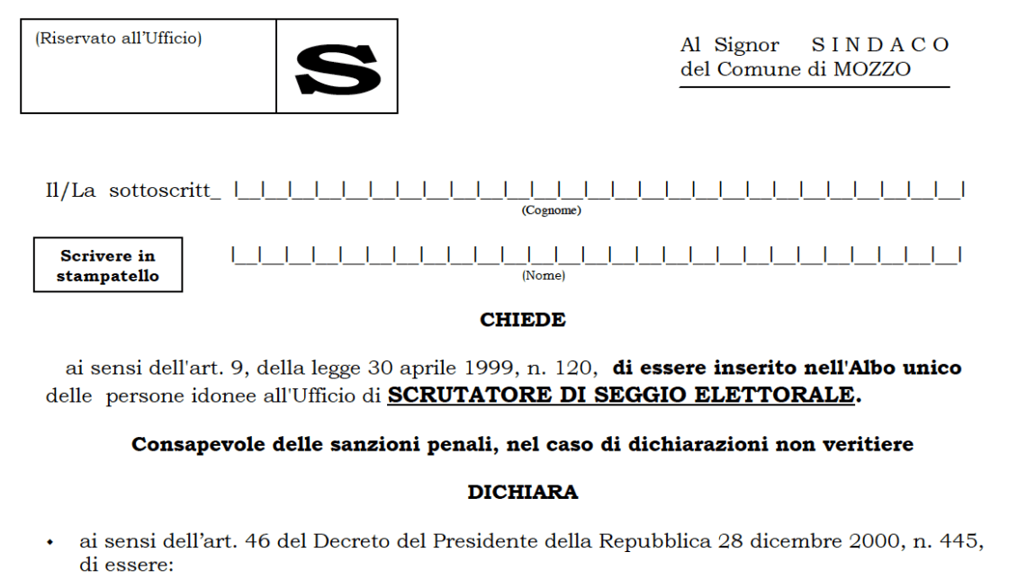 Mozzo/Elezioni 2013: vuoi fare lo scrutatore o presidente di seggio? Hai tempo fino al 30 novembre per presentare la domanda. admin6 novembre 20126 novembre 2012blog post Navigazione articoli PrecedenteContinua qui invece il modulo per l’istanza di Presidente di seggio Condividi:CondivisioneTweet Fai clic qui per stampare (Si apre in una nuova finestra) Stampa Fai clic per inviare un link a un amico via e-mail (Si apre in una nuova finestra) E-mail Mi piace Caricamento... Correlati