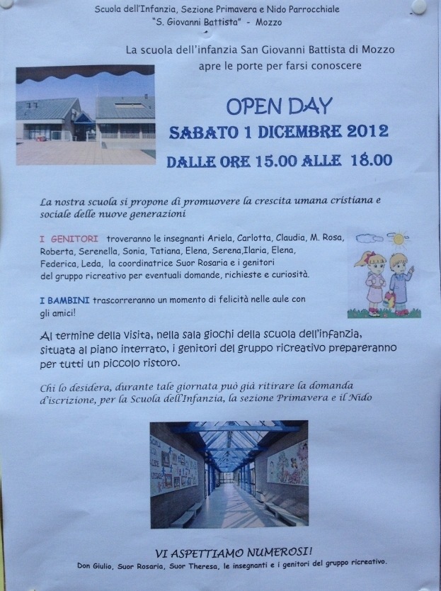 Mozzo/Scuola materna parrocchiale: Open Day il 1 dicembre. Benvenuti admin30 novembre 201230 novembre 2012blog post Navigazione articoli PrecedenteContinua Benvenuti. Condividi:CondivisioneTweet Fai clic qui per stampare (Si apre in una nuova finestra) Stampa Fai clic per inviare un link a un amico via e-mail (Si apre in una nuova finestra) E-mail Mi piace Caricamento... Correlati