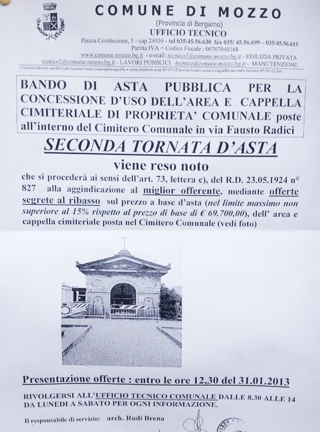 Mozzo/Cimitero: per la Cappella seconda tornata d’asta. Scadenza 31.1.13. admin14 gennaio 201314 gennaio 2013blog post Navigazione articoli PrecedenteContinua Condividi:CondivisioneTweet Fai clic qui per stampare (Si apre in una nuova finestra) Stampa Fai clic per inviare un link a un amico via e-mail (Si apre in una nuova finestra) E-mail Mi piace Caricamento... Correlati