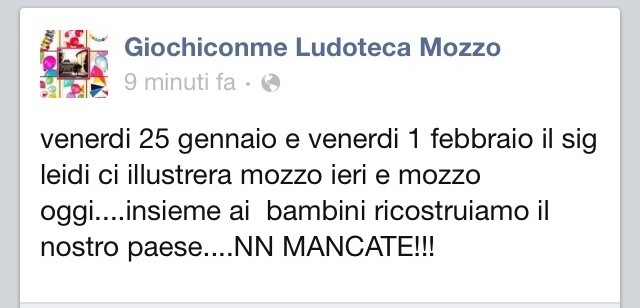 Mozzo/Ludoteca: venerdì 25 gennaio e 1 febbraio “Mozzo ieri e oggi” admin24 gennaio 2013blog post Navigazione articoli PrecedenteContinua Condividi:CondivisioneTweet Fai clic qui per stampare (Si apre in una nuova finestra) Stampa Fai clic per inviare un link a un amico via e-mail (Si apre in una nuova finestra) E-mail Mi piace Caricamento... Correlati