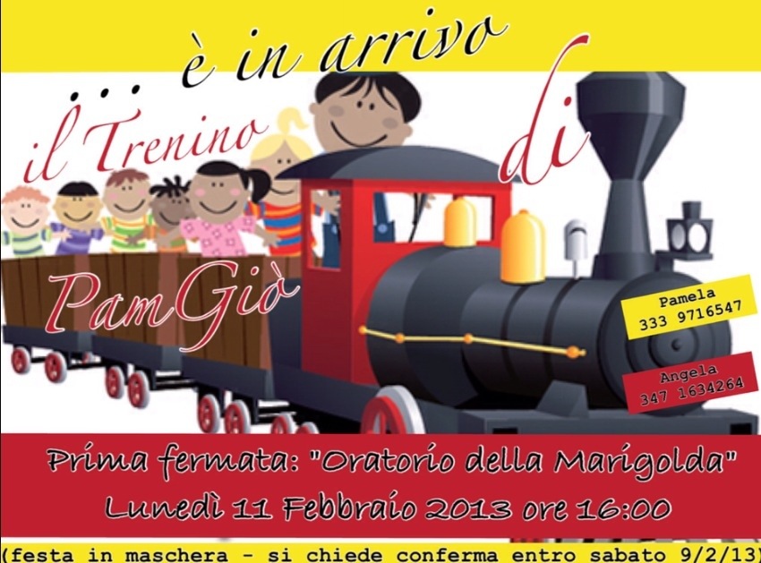 Infine, vi vogliamo invitare alla festa in maschera IL TRENINO DI PAMGIO’: INGRESSO LIBERO APERTO A TUTTI! si richiede conferma entro il 9 febbraio