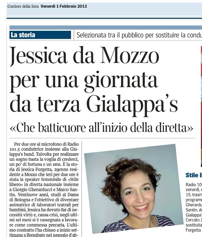 Per due ore al microfono di Radio 101.5 conduttrice insieme alla Gialappàs band. Talvolta per realizzare un sogno basta la voglia di crederci, un pò di fortuna e un sms. È la storia di Jessica Forgetta, 29enne residente a Mozzo che ieri per due ore è stata la speaker femminile di «Stile libero» in diretta nazionale insieme a Giorgio Gherarducci e Marco Santin. Ventinove anni, studi al Dams di Bologna e l’obiettivo di diventare animatrice di laboratori teatrali per bambini, Jessica ha dovuto far di necessità virtù e, causa crisi, negli ultimi sei mesi si è rassegnata a lavorare come commessa precaria. L’ultimo contratto l’ha chiuso a inizio settimana a Brembate nel negozio d’abbigliamento in pelle di una catena commerciale.