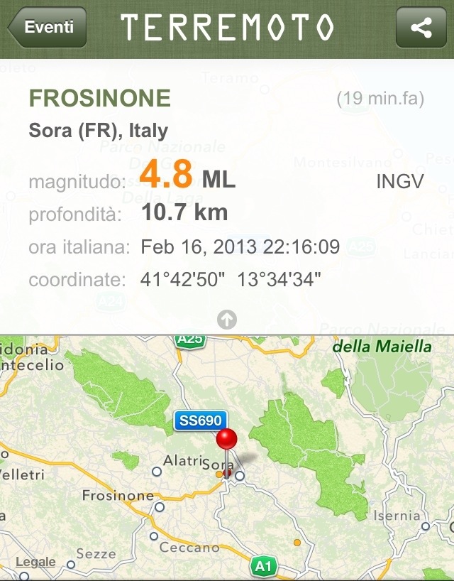 #terremoto nel Lazio (Frosinone) 4,8 alle 22,16, avete sentito anche voi? admin16 febbraio 201317 febbraio 2013blog post Navigazione articoli PrecedenteContinua Condividi:CondivisioneTweet Fai clic qui per stampare (Si apre in una nuova finestra) Stampa Fai clic per inviare un link a un amico via e-mail (Si apre in una nuova finestra) E-mail Mi piace Caricamento... Correlati