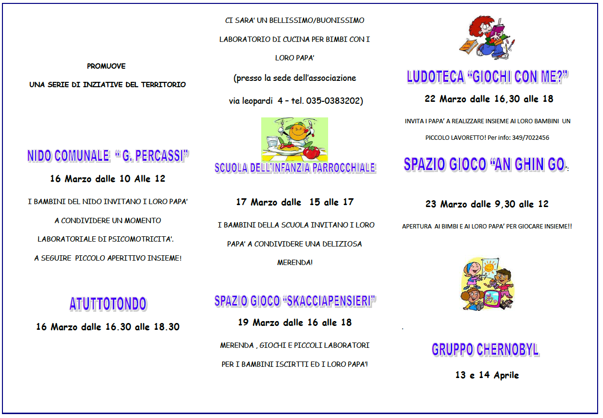 Mozzo: tutti gli appuntamenti del Tavolo Infanzia del Comune di Mozzo admin14 marzo 2013blog post Navigazione articoli PrecedenteContinua scarica qui il volantino FESTA PAPA’ Condividi:CondivisioneTweet Fai clic qui per stampare (Si apre in una nuova finestra) Stampa Fai clic per inviare un link a un amico via e-mail (Si apre in una nuova finestra) E-mail Mi piace Caricamento... Correlati