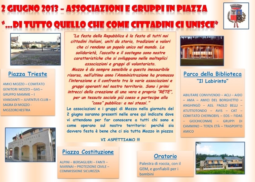 Mozzo: tutte le associazioni nelle piazze il 2 giugno. admin24 Maggio 201324 Maggio 2013blog post Navigazione articoli PrecedenteContinua Condividi:CondivisioneTweet Fai clic qui per stampare (Si apre in una nuova finestra) Stampa Fai clic per inviare un link a un amico via e-mail (Si apre in una nuova finestra) E-mail Mi piace Caricamento... Correlati