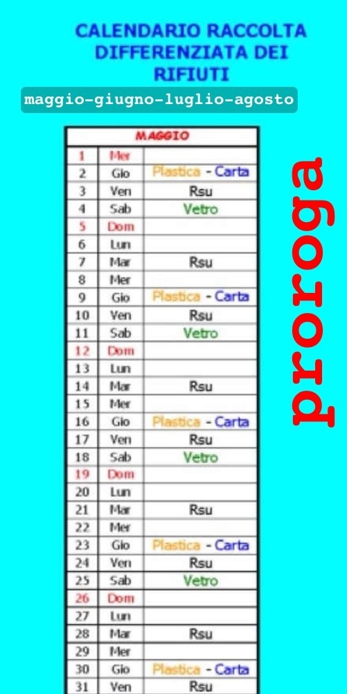 A seguito del ricorso presentato che non permette l’assegnazione definitiva del bando riguardante il servizio di Igiene Urbana, l’Amministrazione Comunale ha deciso di prorogare per i mesi di GIUGNO – LUGLIO – AGOSTO l’attuale servizio in essere con la società Aprica spa. In questi giorni sarà consegnato il nuovo calendario (disponibile anche sul sito del comune) e per tutti coloro che avessero esaurito i sacchi è possibile ritirarli gratuitamente, previo riconoscimento da parte dell’operatore (esibire tessera e/o documento), presso l’area ecologica di via F. Radici.