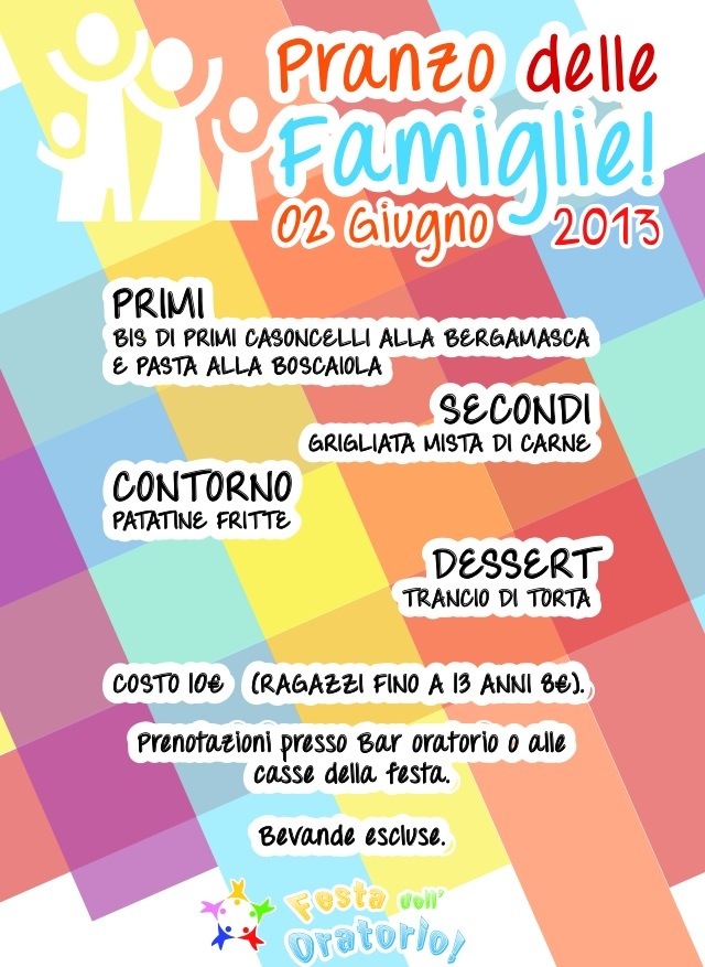 Mozzo/2 giugno: pranzo delle famiglie alla Festa dell’Oratorio. admin31 Maggio 201331 Maggio 2013blog post Navigazione articoli PrecedenteContinua Condividi:CondivisioneTweet Fai clic qui per stampare (Si apre in una nuova finestra) Stampa Fai clic per inviare un link a un amico via e-mail (Si apre in una nuova finestra) E-mail Mi piace Caricamento... Correlati