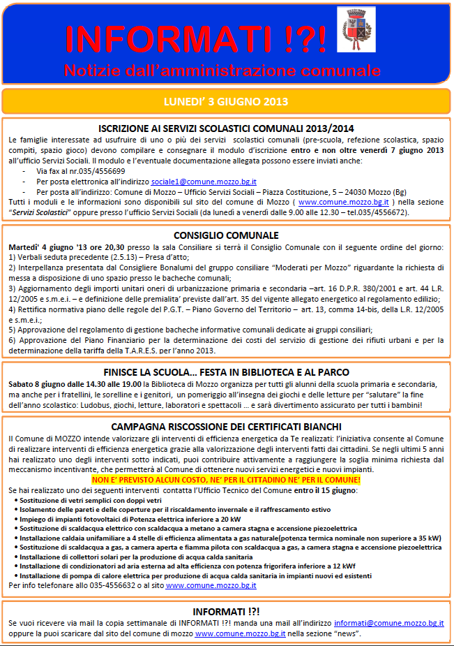 Mozzo/Comune: INFORMATI del 3 giugno 2013. admin3 giugno 20133 giugno 2013blog post Navigazione articoli PrecedenteContinua Condividi:CondivisioneTweet Fai clic qui per stampare (Si apre in una nuova finestra) Stampa Fai clic per inviare un link a un amico via e-mail (Si apre in una nuova finestra) E-mail Mi piace Caricamento... Correlati