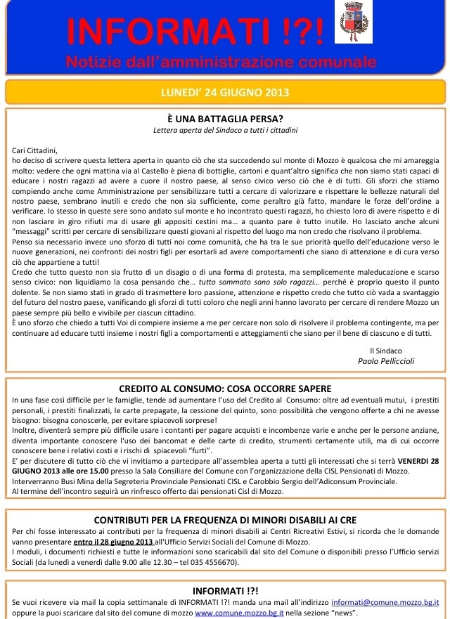 Mozzo/Comune: INFORMATI DEL 24 giugno 2013 admin24 giugno 2013blog post Navigazione articoli PrecedenteContinua Condividi:CondivisioneTweet Fai clic qui per stampare (Si apre in una nuova finestra) Stampa Fai clic per inviare un link a un amico via e-mail (Si apre in una nuova finestra) E-mail Mi piace Caricamento... Correlati