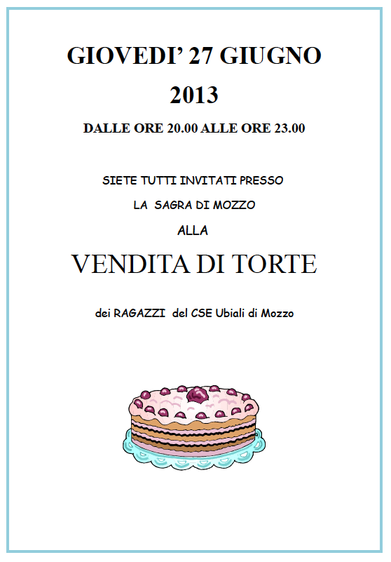 Mozzo/CSE Ubiali: torte per tutti alla sagra, giovedi 27 giugno admin27 giugno 201326 giugno 2013blog post Navigazione articoli PrecedenteContinua Condividi:CondivisioneTweet Fai clic qui per stampare (Si apre in una nuova finestra) Stampa Fai clic per inviare un link a un amico via e-mail (Si apre in una nuova finestra) E-mail Mi piace Caricamento... Correlati