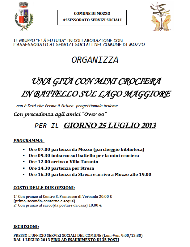 Mozzo: 25 luglio MiniCrociera sul lago Maggiore. Iscrizioni aperte dal 1 luglio. admin1 luglio 201328 giugno 2013blog post Navigazione articoli PrecedenteContinua Condividi:CondivisioneTweet Fai clic qui per stampare (Si apre in una nuova finestra) Stampa Fai clic per inviare un link a un amico via e-mail (Si apre in una nuova finestra) E-mail Mi piace Caricamento... Correlati