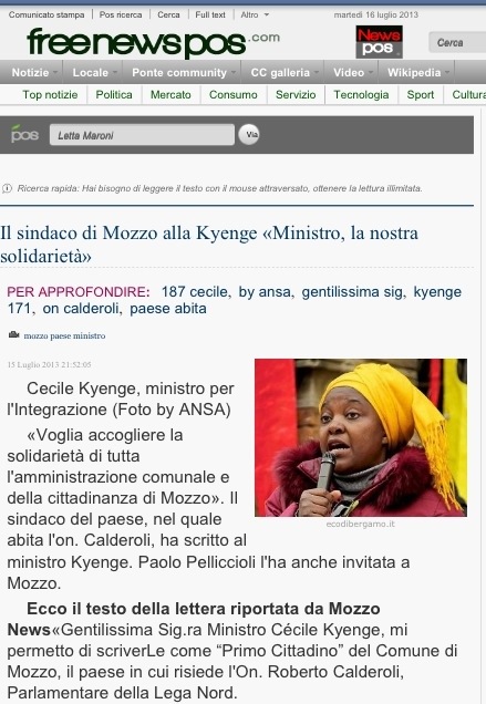 Ecco il testo della lettera riportata da Mozzo News«Gentilissima Sig.ra Ministro Cécile Kyenge, mi permetto di scriverLe come “Primo Cittadino” del Comune di Mozzo, il paese in cui risiede l’On. Roberto Calderoli, Parlamentare della Lega Nord.