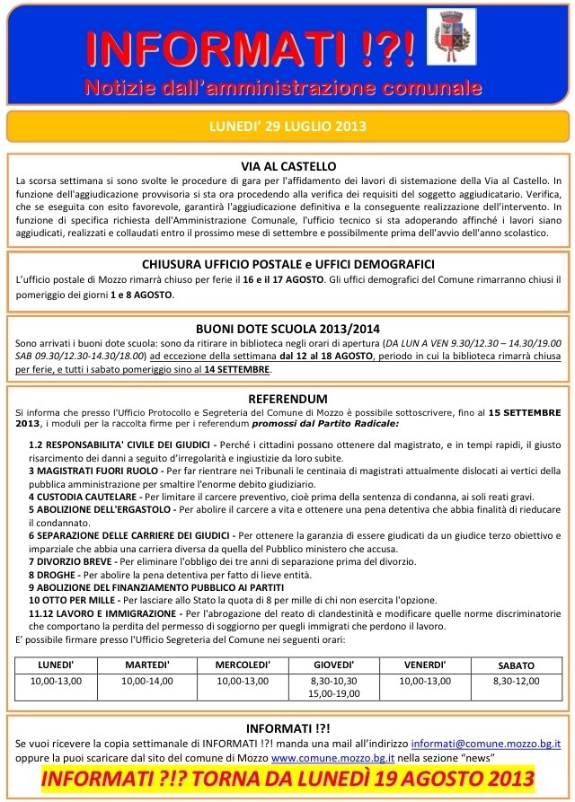 Mozzo/Comune: INFORMATI del 29 luglio admin30 luglio 201330 luglio 2013blog post Navigazione articoli PrecedenteContinua Condividi:CondivisioneTweet Fai clic qui per stampare (Si apre in una nuova finestra) Stampa Fai clic per inviare un link a un amico via e-mail (Si apre in una nuova finestra) E-mail Mi piace Caricamento... Correlati