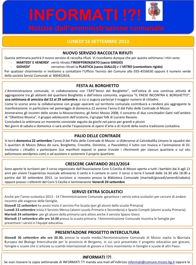 Mozzo/Comune: INFORMATI del 16 settembre admin17 settembre 201316 settembre 2013blog post Navigazione articoli PrecedenteContinua Condividi:CondivisioneTweet Stampa (Si apre in una nuova finestra) Stampa Invia un link a un amico via e-mail (Si apre in una nuova finestra) E-mail Mi piace Caricamento... Correlati