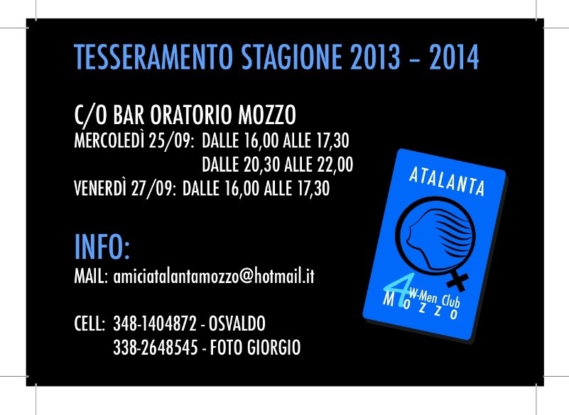 La campagna tesseramento per la stagione 2013 / 2014 si terrà nei prossimi giorni, presso il BAR DELL’ORATORIO di Mozzo, mercoledì 25 settembre dalle 16,00 alle 17,30 e dalle 20,30 alle 22,00 e venerdì 27 settembre dalle 16,00 alle 17,30. Sono previsti prezzi speciali per le famiglie.