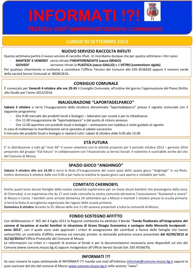Mozzo/Comune: INFORMATI del 30 settembre admin1 ottobre 2013blog post Navigazione articoli PrecedenteContinua Condividi:CondivisioneTweet Fai clic qui per stampare (Si apre in una nuova finestra) Stampa Fai clic per inviare un link a un amico via e-mail (Si apre in una nuova finestra) E-mail Mi piace Caricamento... Correlati