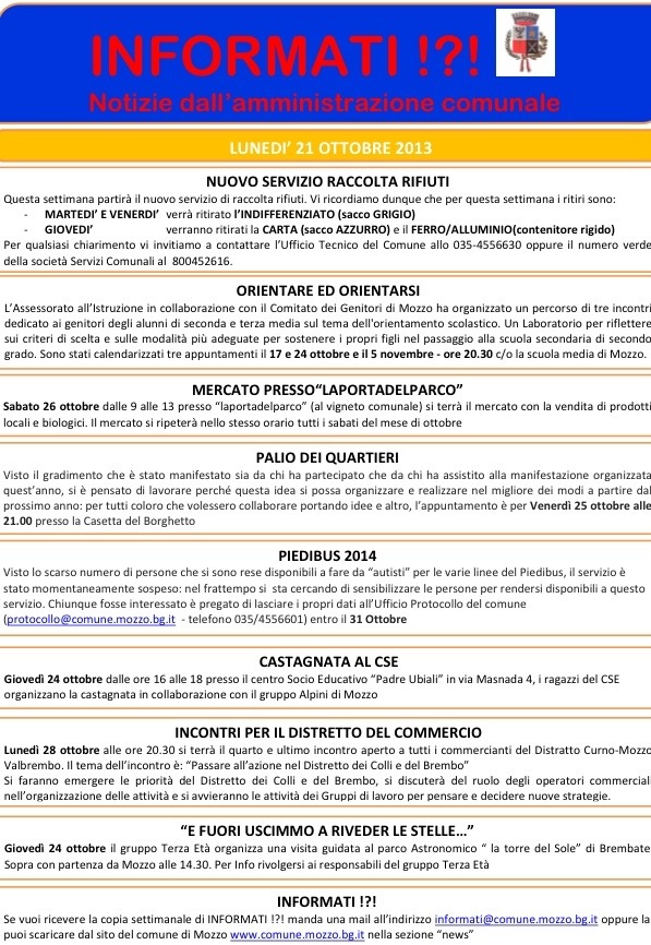 Mozzo/Comune:INFORMATI del 21 ottobre 2013 admin22 ottobre 201322 ottobre 2013blog post Navigazione articoli PrecedenteContinua Condividi:CondivisioneTweet Fai clic qui per stampare (Si apre in una nuova finestra) Stampa Fai clic per inviare un link a un amico via e-mail (Si apre in una nuova finestra) E-mail Mi piace Caricamento... Correlati