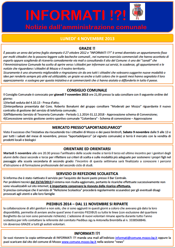 Mozzo/Comune: INFORMATI del 4 novembre 2013 admin5 novembre 20134 novembre 2013blog post Navigazione articoli PrecedenteContinua Condividi:CondivisioneTweet Fai clic qui per stampare (Si apre in una nuova finestra) Stampa Fai clic per inviare un link a un amico via e-mail (Si apre in una nuova finestra) E-mail Mi piace Caricamento... Correlati