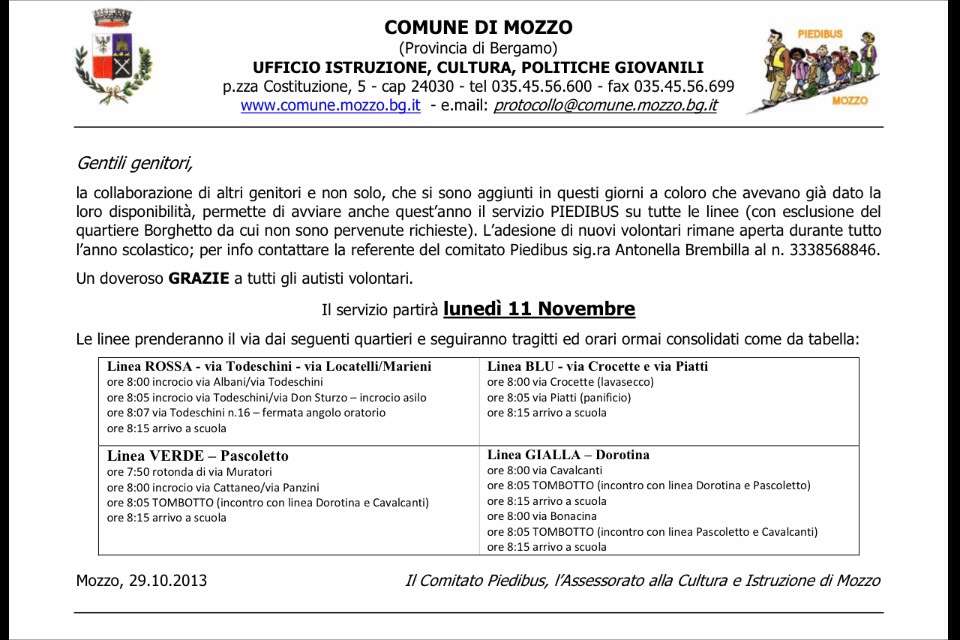 Mozzo/Piedibus: dal 11 novembre, si parte! admin7 novembre 20134 novembre 2013blog post Navigazione articoli PrecedenteContinua Condividi:CondivisioneTweet Fai clic qui per stampare (Si apre in una nuova finestra) Stampa Fai clic per inviare un link a un amico via e-mail (Si apre in una nuova finestra) E-mail Mi piace Caricamento... Correlati