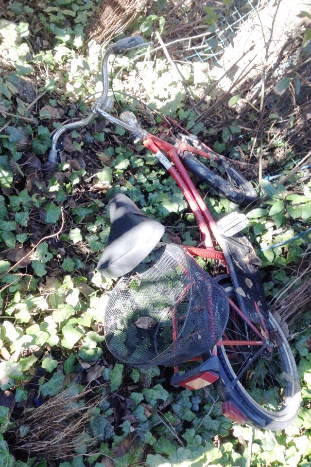 “Segnalo un bici rossa tipo Graziella abbandonata sul costone FFSS nel bosco del tombotto. Grazie”