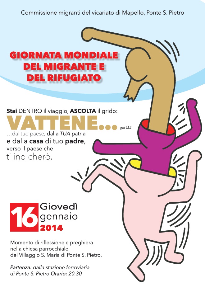 L’incontro consiste in una breve marcia dalla stazione di Ponte San Pietro alla Parrocchia del Villaggio S. Maria, accompagnata da testimonianze di VIAGGIO vissute da migranti e in un successivo momento di preghiera-riflessione biblica in chiesa.