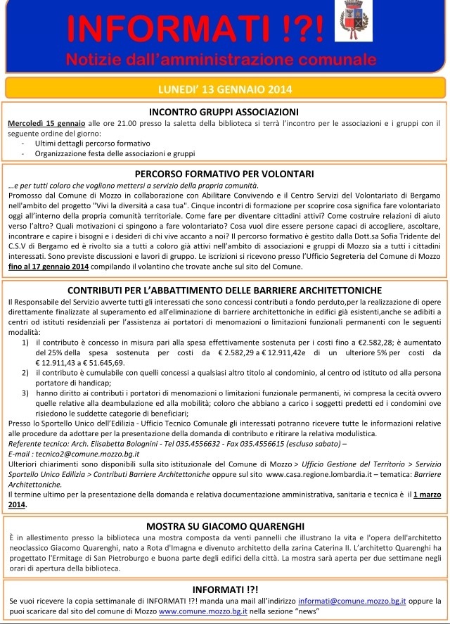 Mozzo/Comune: INFORMATI del 13 gennaio 2014 admin14 gennaio 201413 gennaio 2014blog post Navigazione articoli PrecedenteContinua Condividi:CondivisioneTweet Fai clic qui per stampare (Si apre in una nuova finestra) Stampa Fai clic per inviare un link a un amico via e-mail (Si apre in una nuova finestra) E-mail Mi piace Caricamento... Correlati