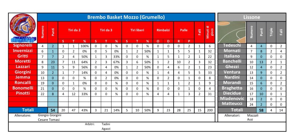 BBM: Signorelli 2, Invernizzi 1, Gritti 7, Moretti 23, Lazzari 11, Giorgini 2, Jemma, Roncalli, Bonomelli, Pinotti 8.