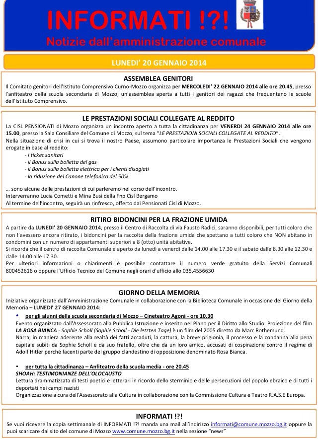Mozzo/Comune: INFORMATI del 20 gennaio 2014 admin21 gennaio 201420 gennaio 2014blog post Navigazione articoli PrecedenteContinua Condividi:CondivisioneTweet Fai clic qui per stampare (Si apre in una nuova finestra) Stampa Fai clic per inviare un link a un amico via e-mail (Si apre in una nuova finestra) E-mail Mi piace Caricamento... Correlati