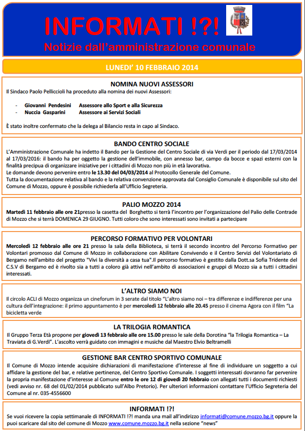Mozzo/Comune: INFORMATI del 10 febbraio 2014 admin11 febbraio 201410 febbraio 2014blog post Navigazione articoli PrecedenteContinua Condividi:CondivisioneTweet Fai clic qui per stampare (Si apre in una nuova finestra) Stampa Fai clic per inviare un link a un amico via e-mail (Si apre in una nuova finestra) E-mail Mi piace Caricamento... Correlati