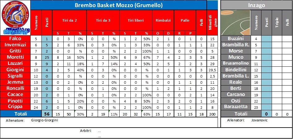 “Ebbene si, profondo giallo, perché l’ultimo referto rosso sprofonda ormai sotto troppi referti gialli accumulati nelle ultime partite. Si parte forte, con grinta e nulla fa presagire al pubblico ospite quale sarà l’epilogo della partita, che cambia faccia al 5 minuto del primo quarto, quando con i Bergamaschi sopra di 9 punti, al coach Jovanovic viene in mente di chiamare il time-out …. in questi pochi istanti succede qualcosa che di fatto termina la partita dei BBMers e da lì in poi sarà solo Inzago. Dopo il fatidico time-out, in soli 3 minuti Morse e compagni a suon scambi rapidi e penetrazioni in area passano dal 5-14 al 18-17; il guizzo finale dei nostri servirà solo a chiudere l’unico quarto a nostro favore di tutta la partita. Dal secondo quarto in poi la solfa non cambia, Inzago prende sempre più il largo …. pressa, attacca, penetra e segna e noi non sappiamo reagire: la difesa fa acqua (come se non ne avessimo già avuta a sufficienza), le azioni offensive sono poco fluide, costruite a fatica e le conclusioni scaturiscono quasi sempre da tiri forzati. Inzago vince meritatamente in quanto più squadra di noi. La prima parte di campionato non ci è bastata per completare il processo di integrazione dei “vecchi” con i “nuovi” e oggi, come in altre occasioni, è stato evidente che la collaborazione e la fiducia, necessarie a rendere la BBM una squadra vincente, non sono ancora sviluppate in modo sufficiente. Questo aspetto dovrà essere tenuto in considerazione al pari di quello tecnico, per completare la costituzione di questo team, che secondo noi, ha tutte le carte per fare bene in futuro. Quando l’organico “gira” si diventa la spina nel fianco delle migliori squadre del campionato, mentre quando non si “gira”, come oggi …… si beccano trenta “canne”! “Comunicato BBM Mozzo