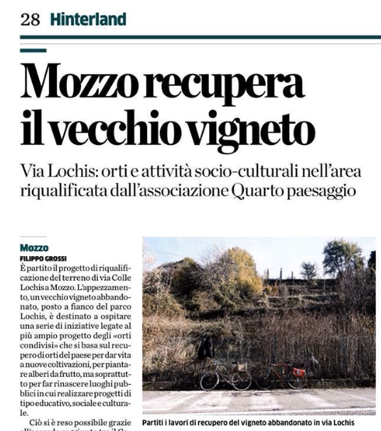 Mozzo: “Mozzo recupera il vecchio vigneto in Via Lochis” L’Eco di Bergamo 28 febbraio 2014 admin28 febbraio 2014blog post Navigazione articoli PrecedenteContinua Condividi:CondivisioneTweet Fai clic qui per stampare (Si apre in una nuova finestra) Stampa Fai clic per inviare un link a un amico via e-mail (Si apre in una nuova finestra) E-mail Mi piace Caricamento... Correlati