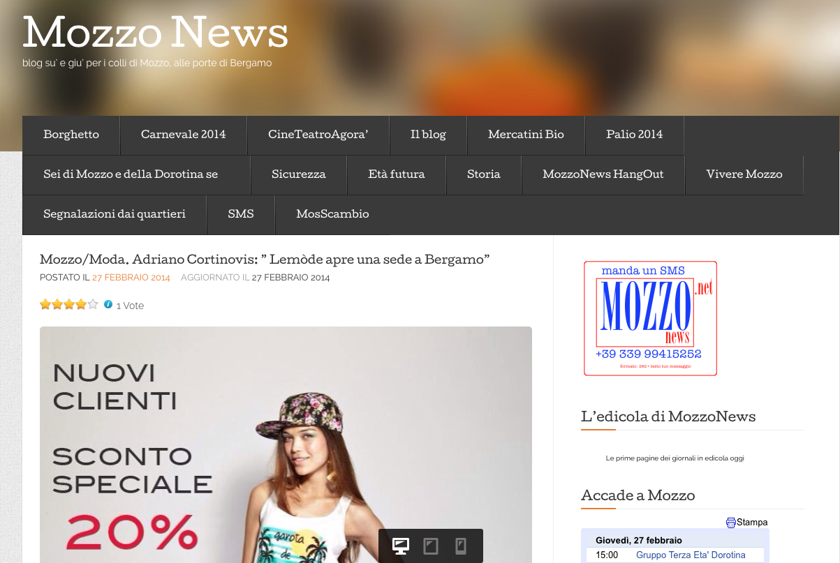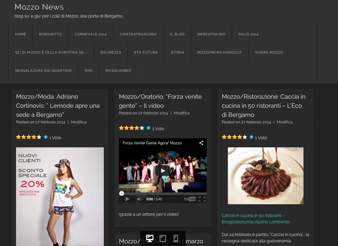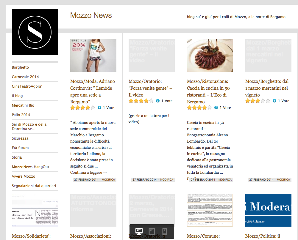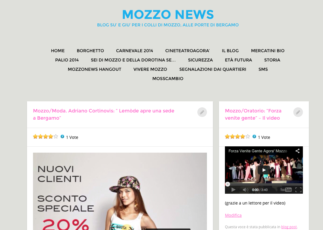 MozzoNews cambia grafica: quale ti piace di più? admin28 febbraio 201428 febbraio 2014blog post Navigazione articoli PrecedenteContinua UNO DUE TRE QUATTRO CINQUE Scrivici quale tema ti piace di più’ QUI Condividi:CondivisioneTweet Fai clic qui per stampare (Si apre in una nuova finestra) Stampa Fai clic per inviare un link a un amico via e-mail (Si apre in una nuova finestra) E-mail Mi piace Caricamento... Correlati